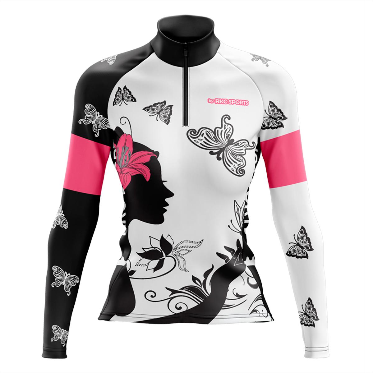 CAMISA CICLISMO FEMININA MOUNTAIN BIKE MANGA LONGA BORBOLETAS BRANCA